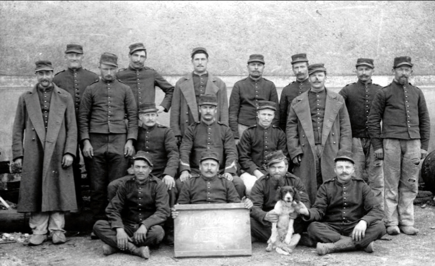 Histoire de la carte postale du Conseil de révision de 1916. La prise de vue du lieu est inconnue. Monsieur Raoul Tassin est identifié, assis au milieu, sur le banc. Il est blessé le 6 avril 1915 au front par un éclat d'obus qui lui fait perdre un oeil, et sera réformé. Il sera cité à l'ordre de l'armée : « S'est fait remarquer maintes fois par son sang-froid et sa belle conduite au feu. Blessé grièvement le 6 avril 1915 en se portant courageusement à l'attaque d'une position ennemie. » Sur les 9 conscrits de 1916, 5 décèderont durant la guerre, parmi lesquels Lucien Pinard, assis à droite sur le banc.