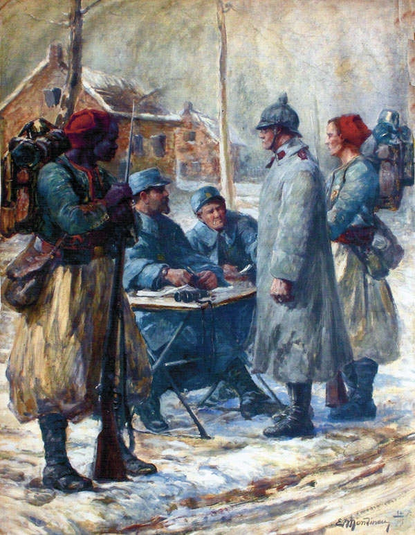 Interrogatoire d'un prisonnier, escorté par deux zouaves.