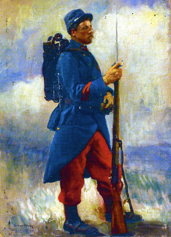 La peinture s'organise autour de la représentation d'une stèle. Les discrètes fuyantes permettent d'imaginer un cénotaphe. Si l'œuvre représente un émouvant hommage aux soldats tués, la présence guerrière, matérielle ou symbolique, reste modérée.