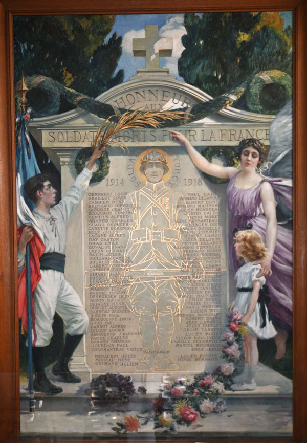 La toile comporte 89 noms. Certains n'apparaissent pas mais sont inscrits sur les deux autres Monuments aux Morts de la commune. Cela s'explique par le fait qu'en 1919, la situation administrative des soldats non rentrés de la guerre n'est toujours pas officialisée. Les soldats portés disparus seront enregistrés ultérieurement, reconnus Morts pour la France et inscrits sur les deux autres monuments.