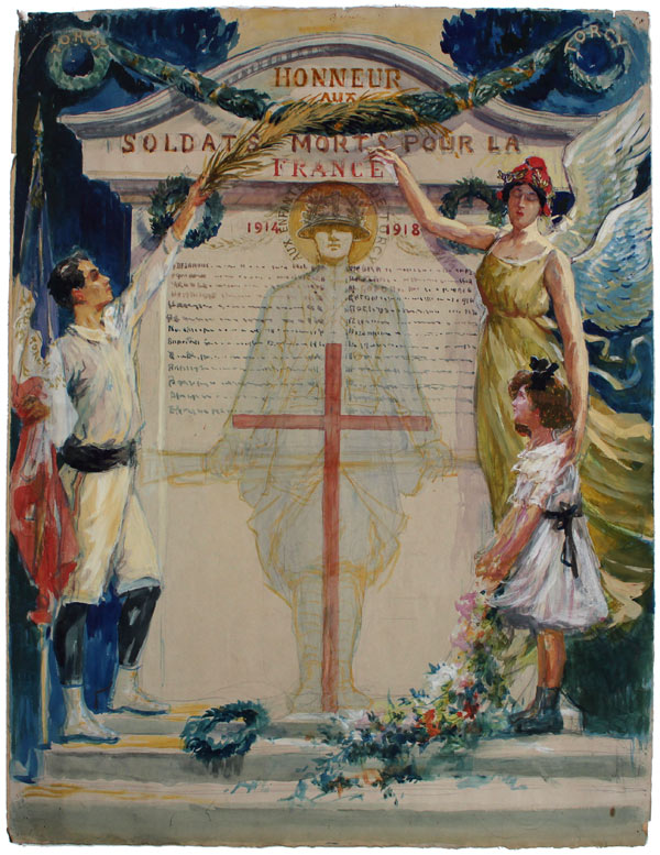 Formant un cadre ovale, trois personnages entourent un jeune soldat : un jeune garçon, une victoire ailée et une petite fille au regard tourné vers le visage en médaillon du héros. La silhouette en uniforme de celui-ci est suggéré graphiquement par un dessin à l'or. En surimpression, l'impressionnante liste de noms et prénoms des victimes de cette guerre se répartie en deux colonnes verticales.